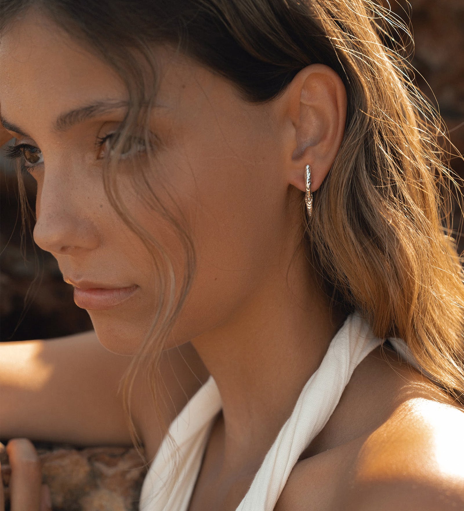 Subtelne, ale charakterne kolczyki MARAI to małe przepływy emocji – inspirowane ruchem wody i nieregularnością natury. Nasze kolczyki tworzymy ze srebra, pozłacanego srebra lub złota.